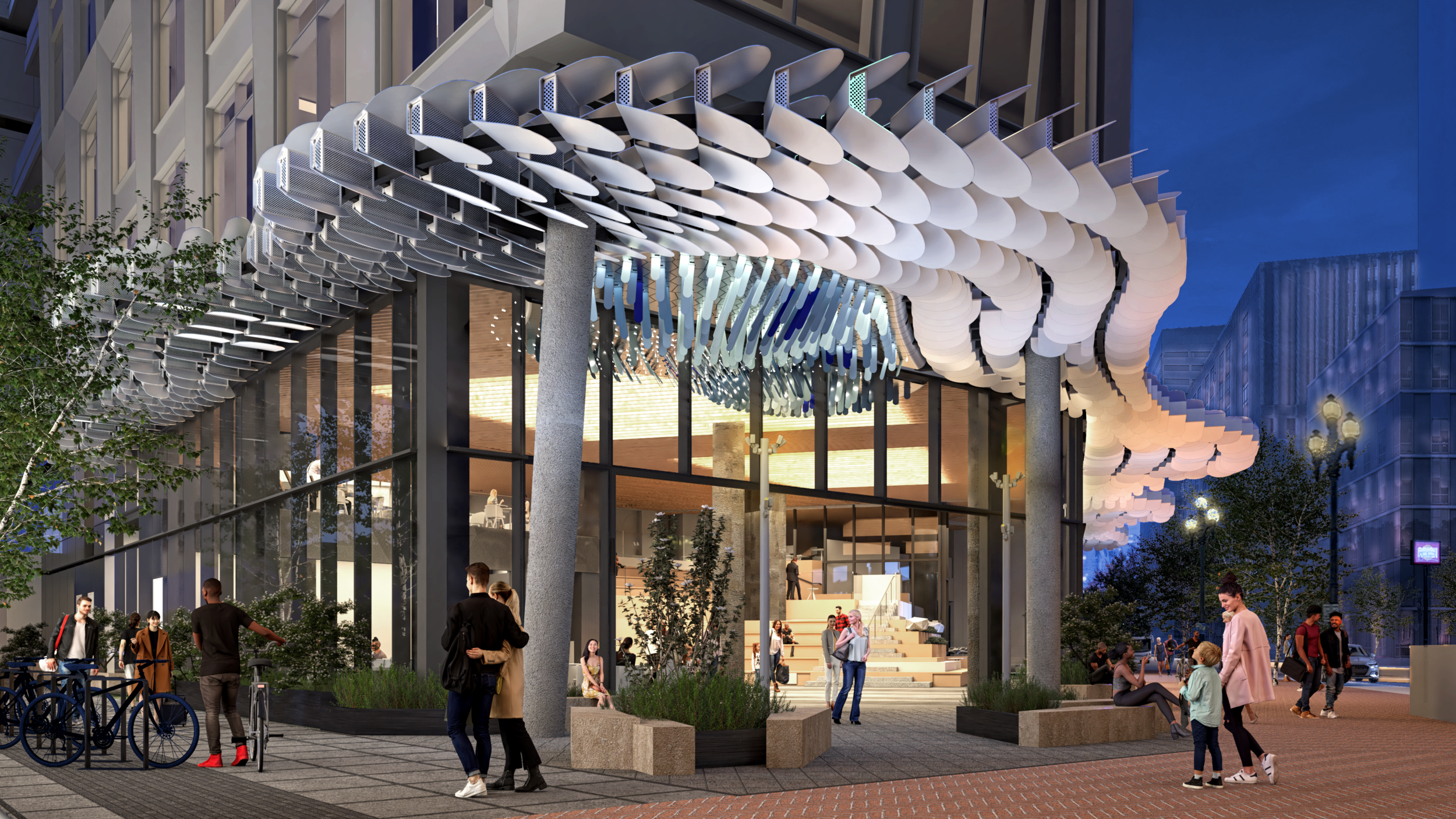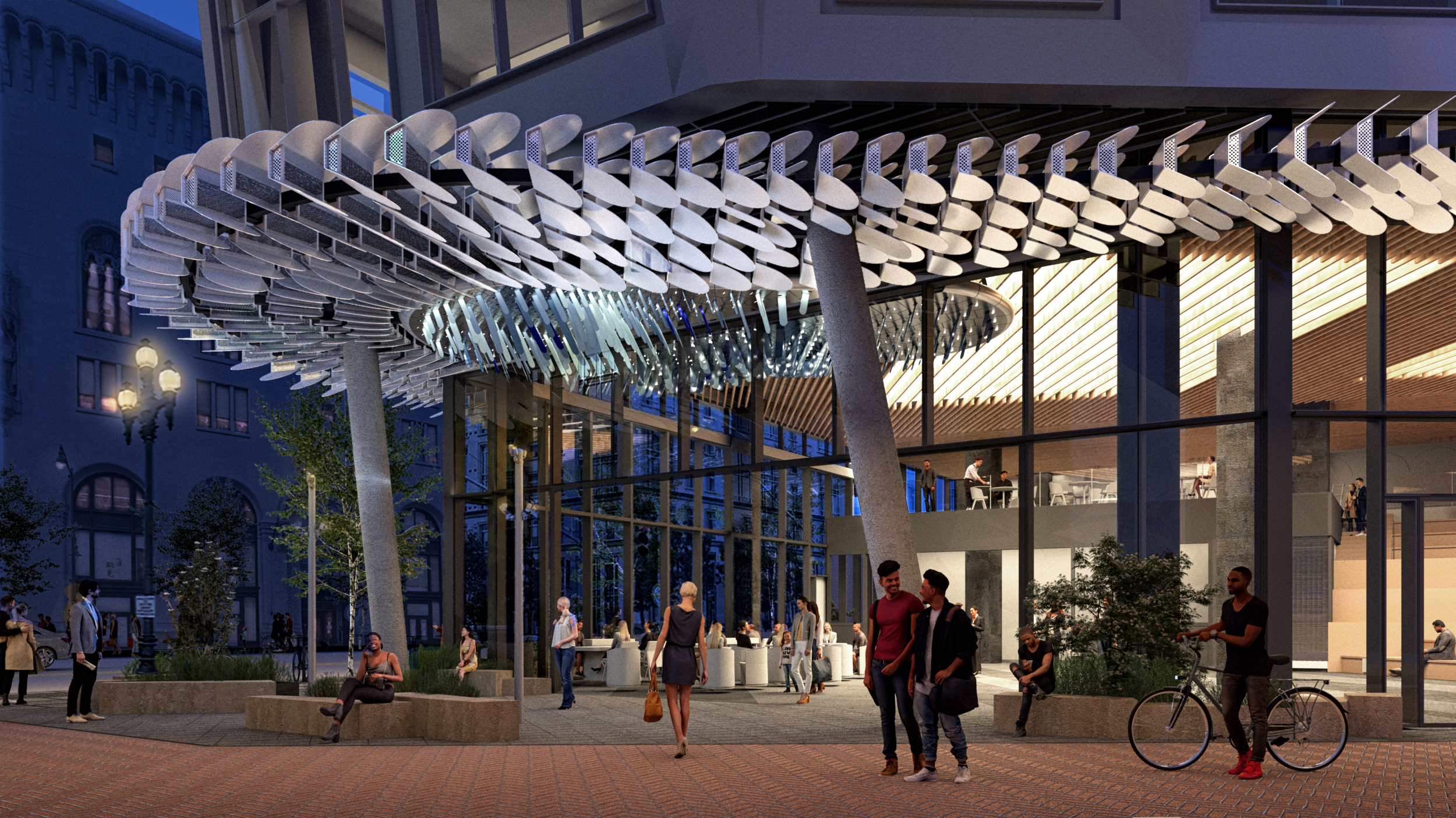Altos is a sculptural wind and shade canopy wrapping around and into the lobby of a large mixed-use building in San Francisco. The exterior cloud-like form is constructed out of hundreds of differently-shaped aluminum fins. This fluid form is suspended above the sidewalk and helps give definition to the corner public space and subway entrance. Floating above the lobby’s corner entry is a dramatic vortex of slender aluminum anodized colored fins. This dynamic storm of blue metal creates a dramatic and animated ceiling for the public space and lobby below.