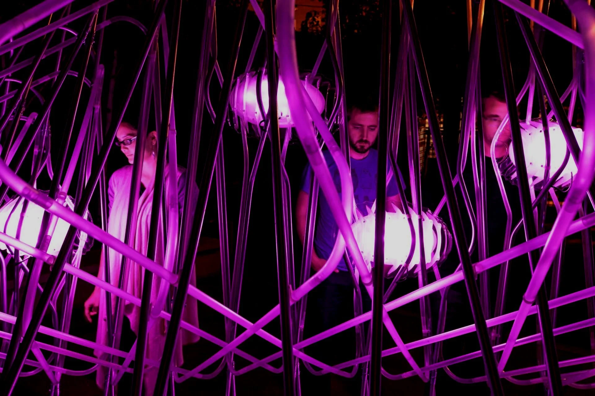 Datagrove was a commissioned installation for the ZERO1 "Seeking Silicon Valley" 2012 Biennial. For three months it was located in the courtyard of the historic California Theater (home of the San Jose Opera). The Datagrove thrives on information from its urban environment. It renders invisible data and atmospheric phenomena into variable intensities of light and sound. It provides shelter and a place of calm to contemplate data streams from sources near and far. The grove’s luminescent fibers gently sway with the breeze and respond to the proximity of visitors with quiet whispering sonic undulations. It aggregates local trending Twitter feeds from San Jose and then whispers these back through speakers and LCDs displays woven into the Datagrove. It functions as a social media "whispering wall" that harnesses data that is normally nested and hidden in smart phones, and amplifies this discourse into the public realm.