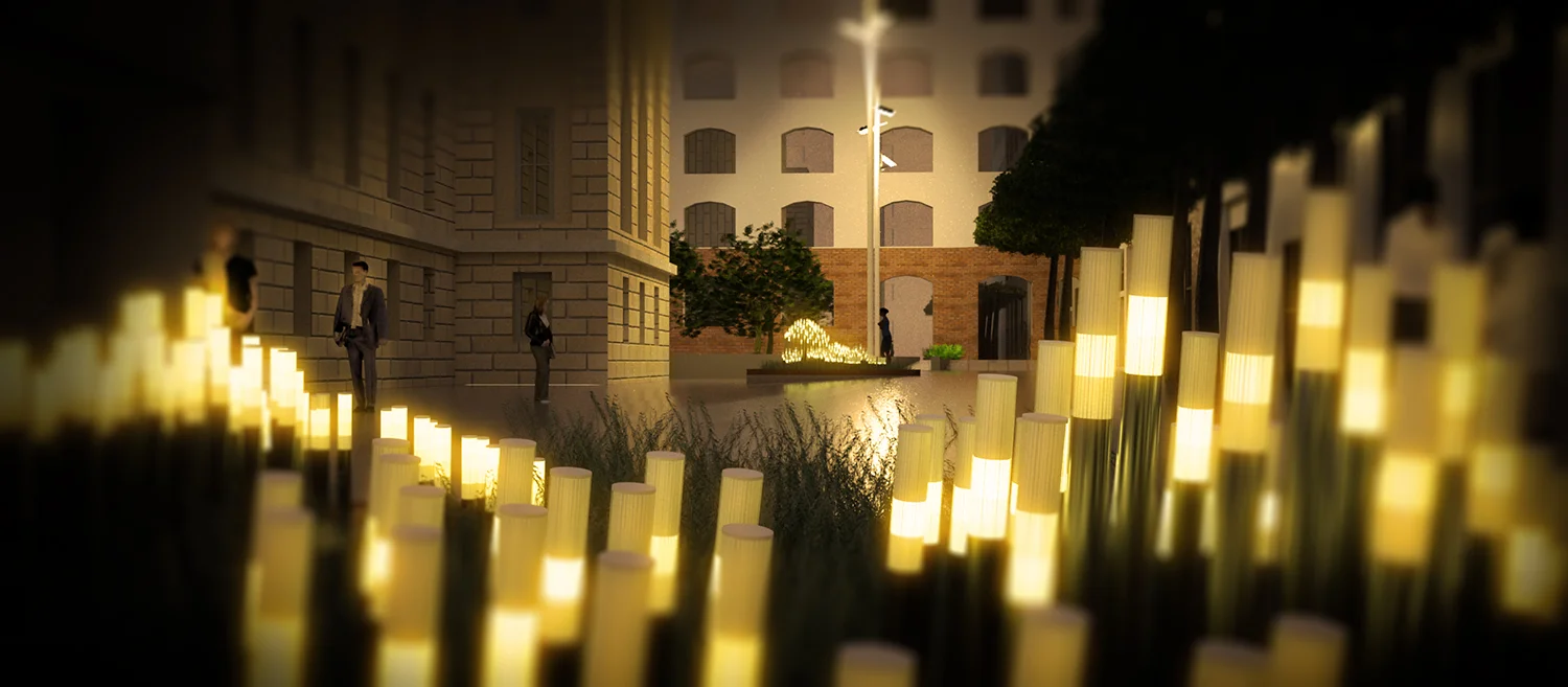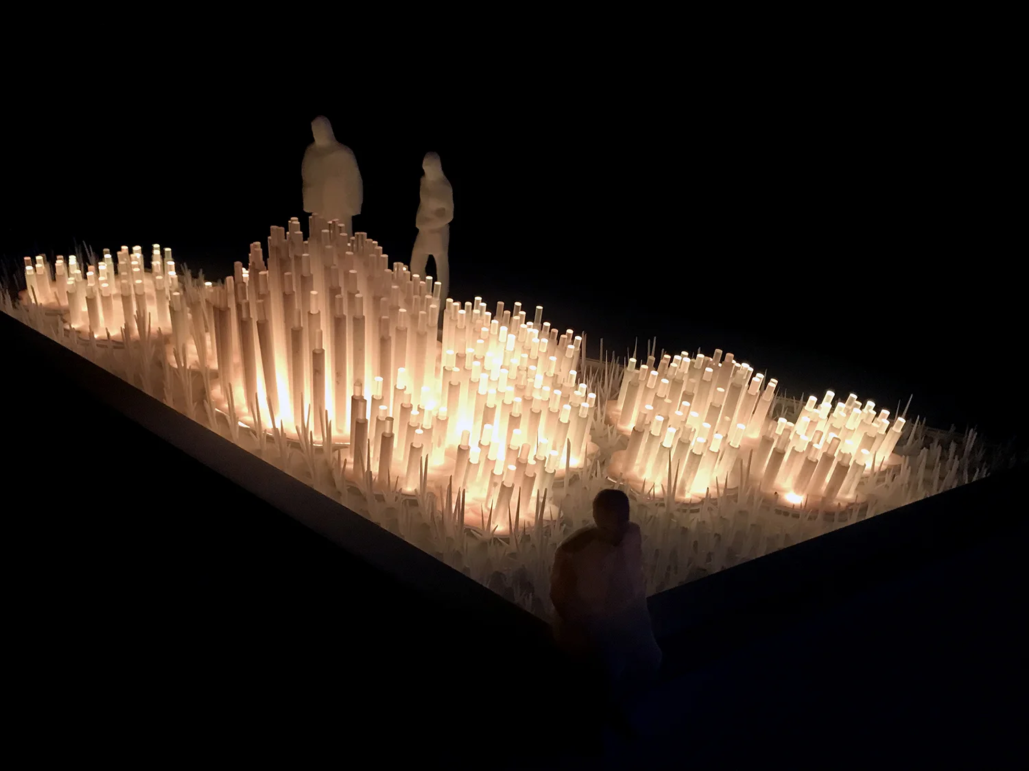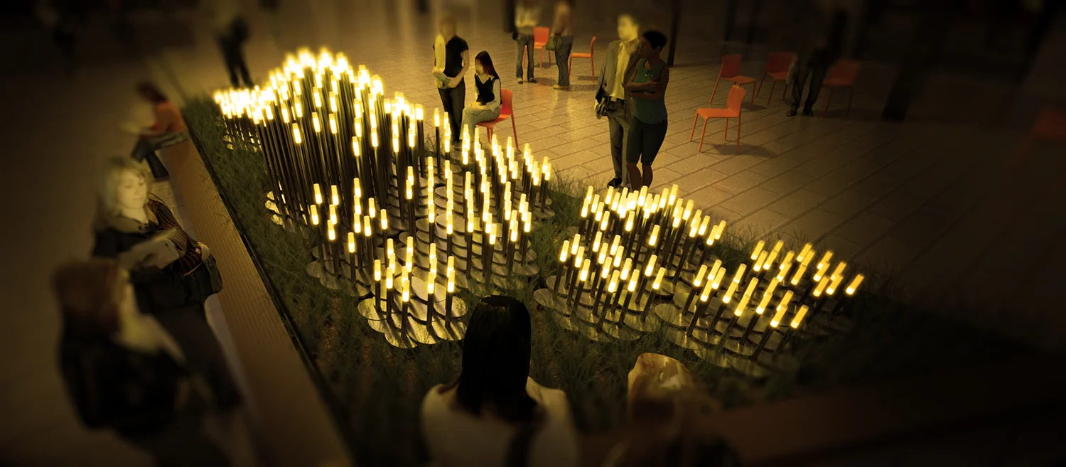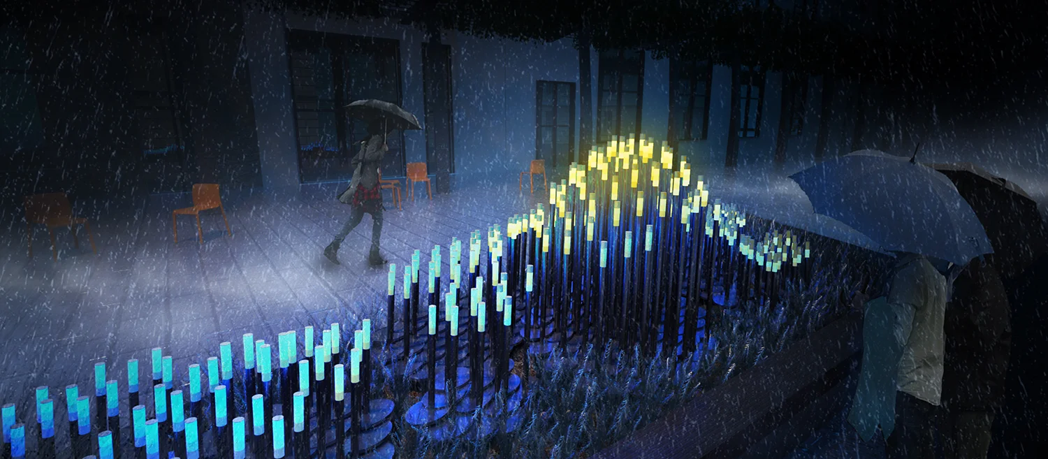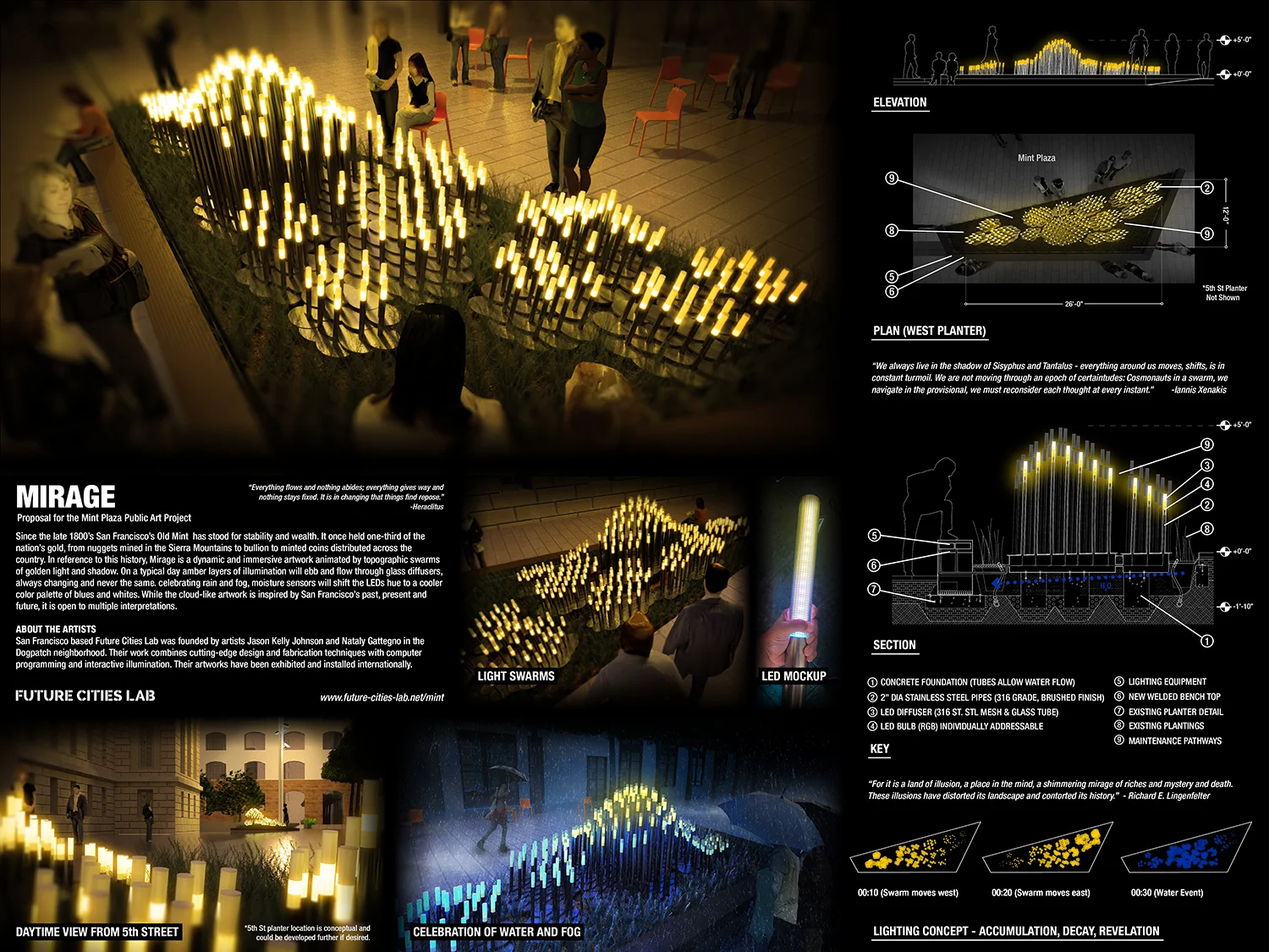 Since the late 1800’s San Francisco’s Old Mint has stood for stability and wealth. It once held one-third of the nation’s gold, from nuggets mined in the Sierra Mountains to bullion to minted coins distributed across the country. In reference to this history, Mirage is a dynamic and immersive artwork animated by topographic swarms of golden light and shadow. On a typical day amber layers of illumination will ebb and flow through glass diffusers, always changing and never the same. Celebrating rain and fog, moisture sensors will shift the LEDs hue to a cooler color palette of blues and whites. While the cloud-like artwork is inspired by San Francisco’s past, present and future, it is open to multiple interpretations.