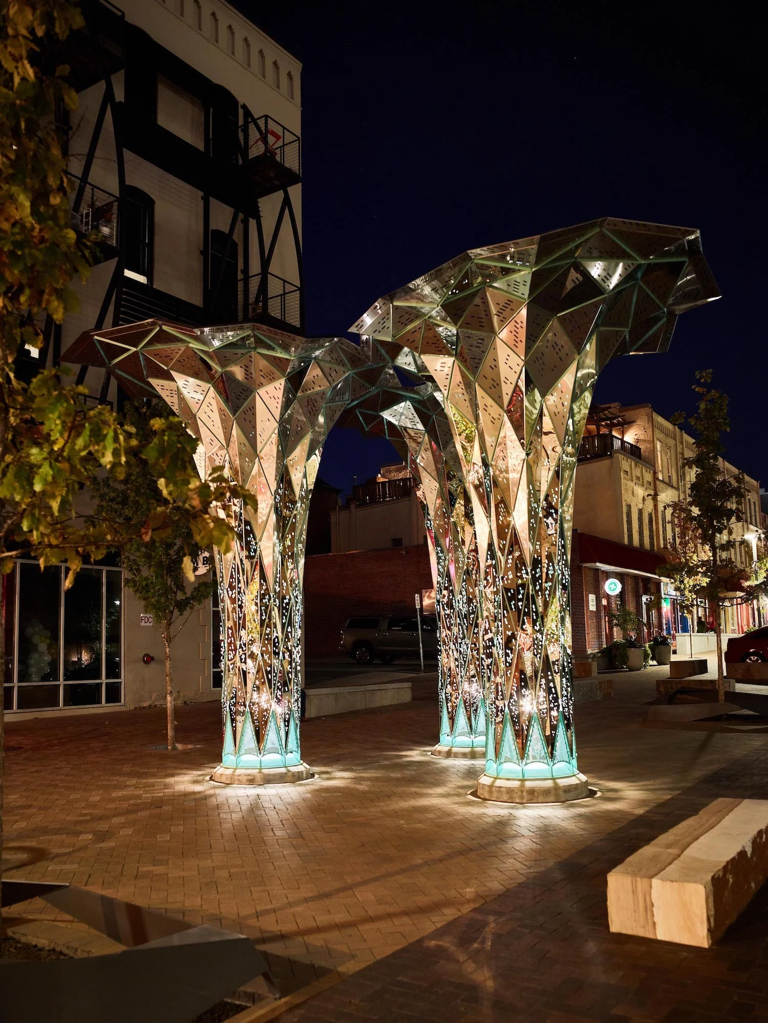 Radiance is a sculptural shade canopy that fosters pedestrian interactions and establishes a dynamic focal point for Chattanooga’s recently transformed Patten Parkway. Since the late 1800’s the parkway has served as a community crossroads for exchange and celebration. It has evolved over time and is layered with both history and optimism towards the future. The public artwork is a key component of a larger redesign that includes the introduction of a pedestrian friendly streetscape which also include outdoor seating, landscape elements, and lighting. The artwork’s faceted skins are meant to inspire spontaneous interactions and playfulness by both adults and children who might enjoy spending time underneath the artwork’s intricate organic structure and kaleidoscopic skin. The artwork is supported by three structural vaults that create an open, shaded and inviting space for people to fluidly move through. It also creates a dramatic backdrop for pedestrians to congregate, sit and view the play of light, shadow and reflectivity from many vantage points.